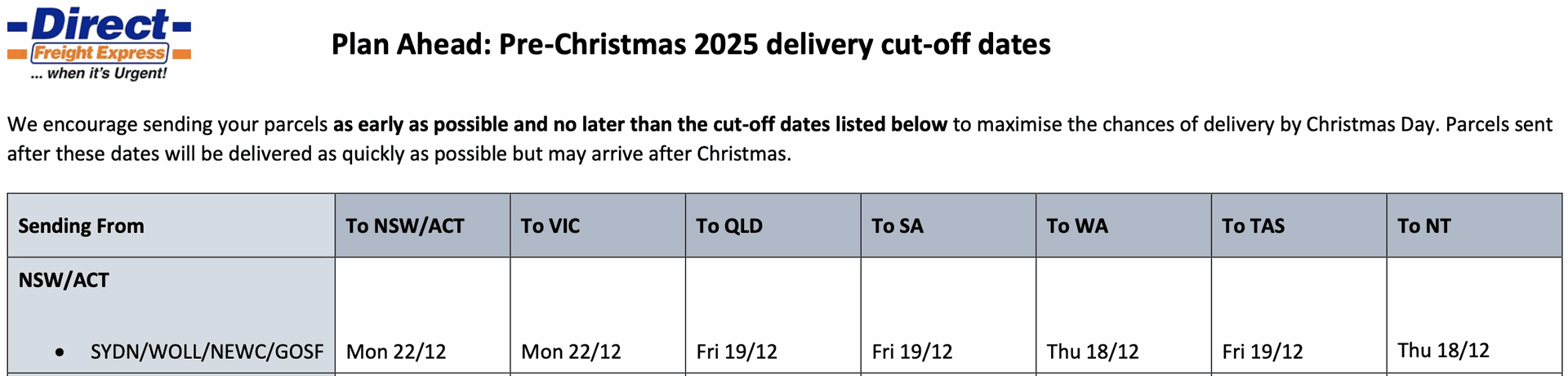 Direct Freight Express have published the shipping cut off dates below to ensure delivery prior to Christmas.