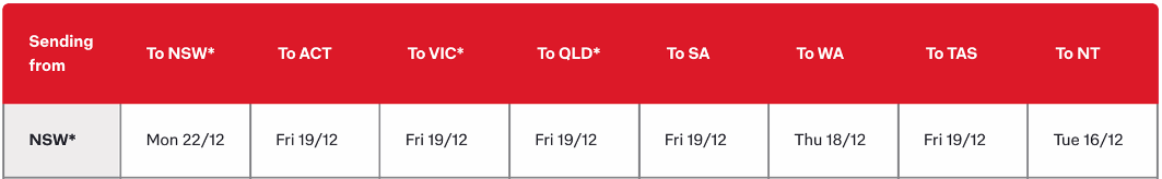 Australia Post recommend orders to be shipped by the following dates to be delivered before Christmas: